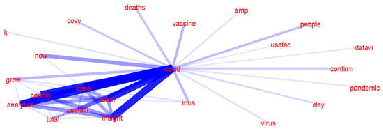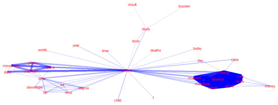 Figure 6 and Figure 7 present the word collocation of the top 50 frequent words in the sample of tweets of social bots and humans. Comparing the two figures, the text content published by social bots is centered on “COVID-19”, and they widely pay attention to various topics related to the news about the evolution of the pandemic. These topics mainly revolve around “disease” and “virus” and are closely related to each other. As shown in Figure 3, words, such as “case”, “country”, “analytics”, “team”, and “USA Facts”, frequently appear in their tweets, which are the focus of discussion among social bots. They are concerned about the real-time data of confirmed cases, mortality, and other epidemic situations in various countries, as well as the overall trend of the development and changes of the pandemic. They pay attention to the real-time data of USA Facts and the COVID-19 vaccine research progress. The topics they care about are closely related to the pandemic itself, and most of these topics are objective and widely disseminated through the news media. On the other hand, the text content published by humans is centered on “people”, and they pay more attention to various secondary topics. These topics are quite different, covering various fields, such as the economy and finance, social order, medical and health, but they are all closely related to people’s lives. As shown in Figure 7, there are three subtopics that have gained more attention. Humans are mostly concerned about the living conditions of individuals under the influence of the epidemic, inter-city population mobility policies, immigration status, and social and economic development.