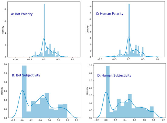 We use Python to run the TextBlob library to perform sentiment analysis on the content of tweets posted by social bots versus humans. It categorizes text into a range from negative to positive, with neutral in the middle. Sentiment is measured primarily through two indicators: polarity and subjectivity. In TextBlob, polarity indicates how negative or positive a sentiment is, expressed as a floating-point number, ranging from −1.0 (negative sentiment) to 1.0 (positive sentiment), with 0 representing neutral sentiment. Subjectivity indicates whether an emotion is based on a trusted or verifiable source or if it is simply an opinion, an emotion, or a judgment. It is represented as a floating value between 0.0 and 1.0, with 1 representing a more subjective (opinion-based) sentiment.