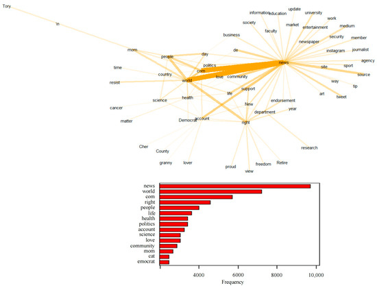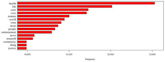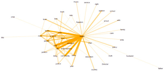 As shown in Figure 10, humans are more concerned with “health” and “life” in their user profiles than social bots are with “news”. In the context of the COVID-19 pandemic, they are concerned about health, their own health status, the spread of the epidemic around the world, and the progress of research into drug treatments. At the same time, education, family, and social issues are also areas of daily interest to humans. This shows that the communication intentions of social bots are more political, while the image of humans is more lifelike. There are significant differences in their marketing management. It should be noted that even when people are aware that social bots are disguising themselves as the accounts of certain official bodies, it is still very difficult to identify which accounts are social bots and which are the real official authority accounts.