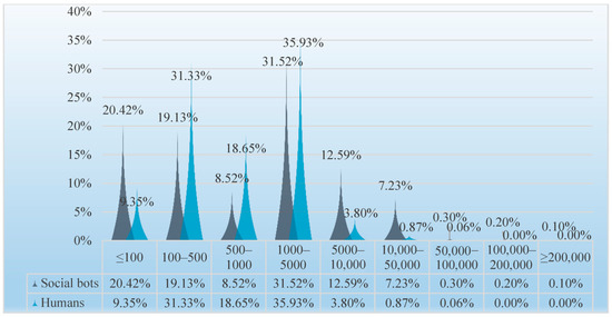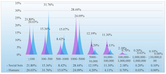 The average number of humans’ followers is 3788.02, and the average number of social bots’ followers is 629,052.08 (the former is 166 times that of the latter). As shown in Figure 11, the number social bots’ followers is the highest in the range of 1000–5000, while the number of humans’ followers is the highest in the range of 100–500, and more than 50% of humans have fewer than 500 followers. Except that the number of humans’ followers in the 100–1000 interval is higher than that of the social bots, in other intervals, social bots have more followers. Especially in the interval above 5000, the number of social bots’ followers is higher than that of the humans. Moreover, one social bot account is a top account with more than ten million followers, while the number of humans in this interval is 0. The number of social bots’ followers is much higher than that of humans. This shows that although social bots do not have a real interpersonal network like humans, they can imitate human behavior to gain more followers’ attention and even become opinion leaders to lead the direction of public opinion.