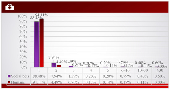As shown in Figure 13, whether it is social bot or human, most accounts only post one tweet. However, comparing the posting volume of the two, it can be found that the proportion of social bots in the accounts that posted more than two tweets is higher than that of humans, and 0.6% of the social bot accounts posted more than 30 tweets, while humans did not. Therefore, social bots are more likely to post multiple tweets to participate in the discussion of COVID-19 issues. After further reading the tweet content posted by these accounts, we found that social bots often post very similar content related to public health, such as the growth rate of cases and epidemic data in different regions, including similar content posted by the same account and similar content posted by different accounts. This explains that social bots achieve the effect of expanding their influence by copying similar content.