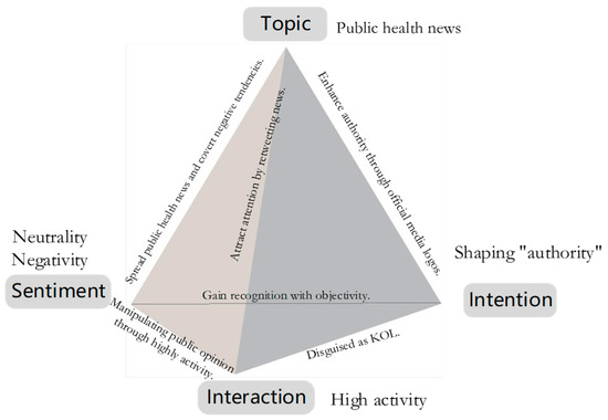 Studies have shown that social bots appear in discussions on public health issues and hot social events, such as discussions on measles vaccination, discussions on US elections, Brexit, and Sino-US trade negotiations [59,60]. According to the analysis results, social bots are also active in the discussion of topics related to COVID-19 pandemic. Moreover, 22% of these social media accounts participating in the discussion were social bots and 78% were humans. Social bots are not only content dissemination channels and intermediaries, but also participate in the process of discussions on public health topics on Twitter from multiple perspectives. We built user persona for social bots in public health issues (COVID-19 pandemic) after comparing and analyzing the differences between social bots and humans in terms of topics, sentiment, intention, and interaction (Figure 14).