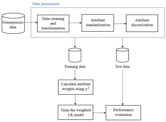 Algorithm 1 shows our proposed attribute weighted logistic regression, where the weights are calculated using χ2 measure. First, the attribute weight in the training dataset is calculated using χ2 measure. Then, these attribute weights are incorporated to train the LR model (Equation (3)).