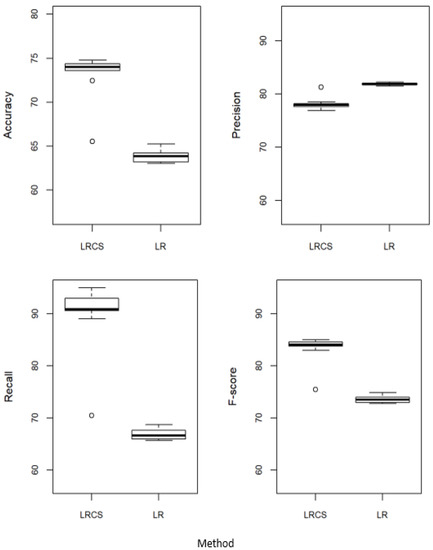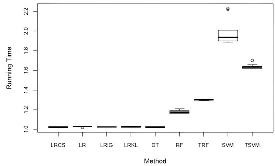 Figure 5 shows the running time of LRCS against all the baseline methods. Both the runtimes of TSVM and TRF were calculated after the tuning process was complete. The tuning of SVM took about 1.5 days, while the tuning of RF took about 30 min. All the experiments were performed using RStudio (ver. 1.1.453) on a desktop computer with an Intel Core i5-6500 3.2 GHz and 8 GB RAM. The standard LR and all weighted LR (LRCS, LRIG, and LRKL) have comparable computational times. These results showed that our method to incorporate attribute weights into LR does not increase the computational time. In comparison to the five baseline classification methods (DT, RF, TRF, SVM, and TSVM), LRCS has a comparable computational time with DT, while RF, TRF, SVM, and TSVM have a longer running time. The running time of SVM is almost twofold longer than LRCS.