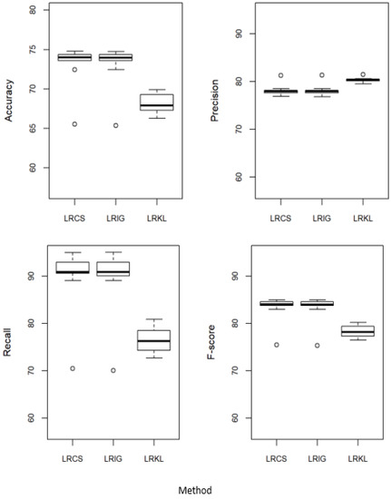 Figure 2 compares the performance of our method, the χ2 weighted logistic regression (LRCS), with the standard logistic regression (LR). LRCS outperformed LR in accuracy, recall, and F-score. The performance of LRCS is about 10% better than that of LR in accuracy and F-score and 20% better in recall. In terms of precision, LR performed slightly better than LRCS.