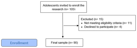 Ninety adolescents participated in the study; however, 105 adolescents were invited to participate in this study (response rate: 84.8%) as seen in Figure 1. Forty-six participants were girls (51.7%) and forty-four were boys (48.3%). The mean age was 15.9 years (SD = 1.66).