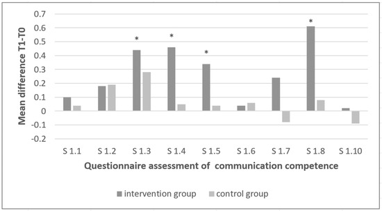 In contrast, within the control group, there were no significant differences between the two time points for any of the statements. In the control group, there was a trend toward worsening with respect to the statements 1.7 (I can deal with different behaviors of the patient, p = 0.935) and 1.10 (I give the patient the opportunity to describe his or her own concerns, p = 0.735) at T1 compared with T0 (Figure 1).