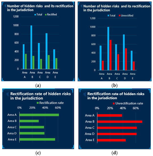 By investigating the existing VIS presentation interface, we found that the common VIS included information such as the basic information of hidden risks, the number of hidden risks and their rectification, and the degree of risk warning. Combined with the three-stage SA theory, the main VIS elements used in this study were selected, including the statistical chart for the number of hidden risks and their rectification, the statistical chart of the hazard-rectification rate, and the risk-warning chart in the jurisdiction, which are presented in this paper in a vertical bar chart, horizontal bar chart, and dashboard chart, respectively (Figure 1 and Figure 2). Combined with the theory of framing effect, the attribute frames were manipulated using the “number of rectified hazards” and “number of unrectified hazards,” “rectification rate of hazards,” and “unrectified rate of hazards” (Figure 1). To reproduce the VIS-presentation-interface reality, we show the corresponding bar charts in green and red colors to represent “safe” and “danger,” respectively. Previous studies revealed that red was recognized globally as the color for danger, and this was consistent across cultures and occupations; green, although not recognized globally as the color for “safe,” represented “low risk” in most cultures and “safe” in the Chinese cultural context [27]. Therefore, in this study, green and red colors were chosen to represent the “safe” and “danger” messages, respectively.