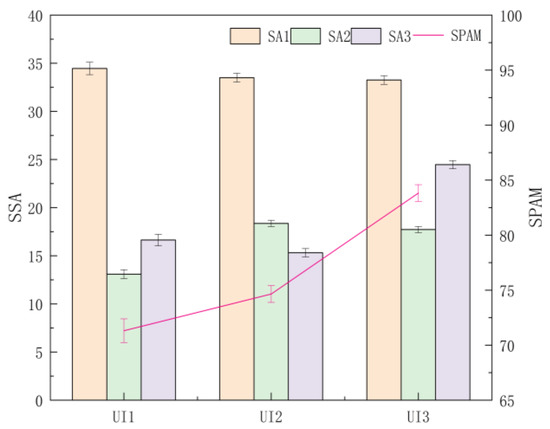 A multi-way ANOVA was conducted on the three-stage SA theory, and the overall scores of SA between UI levels were obtained. It was found that the stage score of perception (SSA1) was not significantly different (F (2, 544) = 0.482, p = 0.618, = 0.002), the overall mean of which showed a trend of UI1 > UI2 > UI3. The stage score of comprehension (SSA2) was significantly different (F (2, 544) = 30.949, p < 0.001, = 0.102), and a post hoc test revealed that the SSA2 of UI2 and UI3 were significantly greater than that of UI1 (p < 0.001), with the overall mean showing a trend of UI2 > UI3 > UI1. The stage score of projection (SSA3) was significantly different (F (2, 544) = 126.546, p < 0.001, = 0.318), and a post hoc test revealed that the SSA3 of UI1 was significantly greater than that of UI2 (p = 0.012 < 0.05) and that the SSA3 of UI3 was significantly greater than that of UI1 and UI2 (p < 0.001), with the overall mean showing a trend of UI3 > UI1 > UI2. The total SPAM score was significantly different (F (2, 544) = 54.820, p < 0.001, = 0.168), and the post hoc test revealed that the total score of UI3 was significantly greater than that of UI1 and UI2 (p < 0.001), that the difference between UI1 and UI2 was significant (p = 0.042 < 0.05), and that the mean value of the total SPAM score was ranked UI3 > UI2 > UI1 (Figure 5).