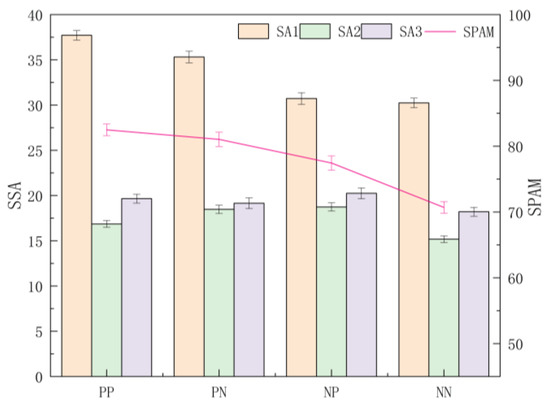A multi-way ANOVA was conducted for three-stage and total SA scores under each presentation frame, and it was found that the differences in the perception stage score (SSA1) were significant (F (3, 544) = 42.580, p < 0.001, = 0.190), with post hoc tests finding significant differences between the frames except between the NP and NN frames, with the overall mean presented as PP > PN > NP > NN. The difference in the comprehension stage score (SSA2) was significant (F (3, 544) = 5.342, p = 0.001, = 0.029); post hoc tests found the SSA2 of NN frame significantly smaller than that of PP, PN, and NP frames (p < 0.001, p = 0.019 < 0.05); and the overall mean was NP > PN > PP > NN. By contrast, people scored higher SSA2 in the comprehension stage under a combination of positive and negative frames. For the projection stage score (SSA3), the differences were not significant across presentation frames (F (3, 544) = 2.132, p = 0.095, = 0.012), with the overall mean presented as NP > PP > PN > NN. For the total SPAM score, the differences were significant (F (3, 544) = 31.898, p < 0.001, = 0.150), and post hoc tests revealed that there were significant differences between the frames except for the PP and PN frames, NP frame, and PN frame, with the overall mean presented as PP > PN > NP > NN (Figure 6).