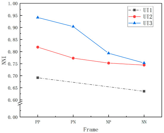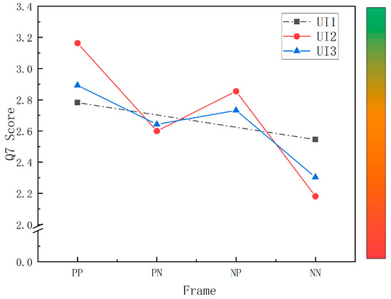 A multi-way ANOVA on the Q7 scores revealed that the overall perception of risk did not differ significantly among UI levels (F (2, 544) = 0.297, p = 0.743, = 0.001), with the mean values showing a trend of UI2 > UI1 > UI3. However, the difference between presentation frames was significant (F (3, 544) = 15.201, p < 0.001, = 0.077), and a post hoc test revealed that the Q7 score of the PP frame was significantly greater than that of PN and NN (p = 0.021 < 0.05, p < 0.001), that NP was significantly greater than that of NN (p < 0.001), and that the mean score of Q7 was generally presented as PP > NP > PN > NN, with a higher Q7 score representing less perceived risk. The interactions between UI and frame were significant (F (4, 544) = 2.841, p = 0.024, = 0.020), and further simple-effects analysis revealed that the difference in perceived risk across presentation frames within UI1 was not significant (F (1, 544) = 2.166, p = 0.142 > 0.05, = 0.004), that the difference in perceived risk within UI2 was significant (F (3, 544) = 13.374, p < 0.001, = 0.069), and that the Q7 score of the PP frame was significantly greater than that of PN and NN (p = 0.003 < 0.05, p < 0.001). The Q7 score of the NP frame was significantly greater than that of the NN frame (p < 0.001); the difference in perceived risk across representation frames within UI3 was significant (F (3, 544) = 4.885, p = 0.002 < 0.05, = 0.026), and the Q7 score of the PP and NP frame was significantly greater than that of the NN frame (p < 0.001, p = 0.043 < 0.05) (Figure 9).