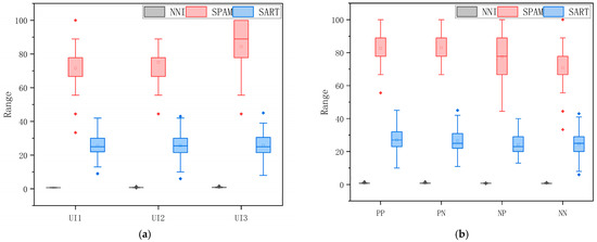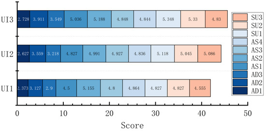 A multi-way ANOVA was conducted on each dimension, and total scores were obtained by SART among UI levels. The results show that the dimension scores of AD and SU (SAD and SSU) were significantly different among UI levels (F (2, 544) = 10.456, p < 0.001, = 0.037; F (2, 544) = 11.552, p < 0.001, = 0.041). Through a post hoc comparative analysis, it was found that UI3 was significantly greater than UI2 and UI1 in the SAD (p = 0.036 < 0.05, p < 0.001) and that there were significant differences between UI1 and UI2 (p = 0.027 < 0.05), with UI2 obtaining a higher score. It can be seen from the mean value that the SAD increased with the UI level, that is, UI3 > UI2 > UI1; for the SU dimension, the SSU of UI3 and UI2 were significantly greater than that of UI1 (p < 0.001, p = 0.003 < 0.05), and subjects’ acquisition and understanding of the information showed a trend of increasing with UI levels. For the dimension scores of AS (SAS), the differences were not significant between UI levels (F (2, 544) = 1.660, p = 0.191, = 0.006), and the mean value was UI2 > UI3 > UI1. There was no significant difference in the total score of SART (F (2, 544) = 0.361, p = 0.697, = 0.001), but the overall mean showed UI2 > UI3 > UI1 (Figure 7).