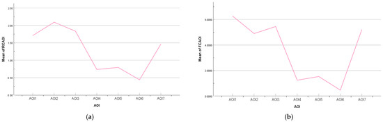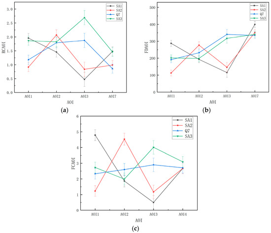 - Eye-movement indexes: the nearest neighbor index (NNI), the average regression count in the area of interest (RCAOI), the average fixation count in the area of interest (FCAOI), and the average fixation duration in the area of interest (FDAOI) were selected as eye-movement indexes. Among them, the NNI-fixation index is a commonly used clustering algorithm, based on the distance between gaze points within a region, which is influenced by the subjects’ SA level and visual-search strategy, measuring the spatial dispersion of their gaze points [40]. When NNI < 1, the points are aggregated; when NNI = 1, the points are randomly dispersed; when NNI > 1, the points are regularly dispersed. The gaze and look-back behavior for a visual element reflect the attention allocation, acquisition, and storage [34,41]. The regression count reflects the individual’s level of reprocessing of information [42], while the fixation count reflects the subject’s ability to extract information during the task; the higher the number of gaze points, the more attention the subject pays to the area and the more useful information the subject can extract [43]. The average fixation duration is generally used for coding tasks. The longer the fixation duration, the more difficult it is to extract information, the greater the cognitive load, or the more appealing the target [44]. Thus, the abovementioned eye-movement indicators were chosen to measure the overall and local distribution of attention and its correlation with the level of SA in each UI level and presentation frame.
