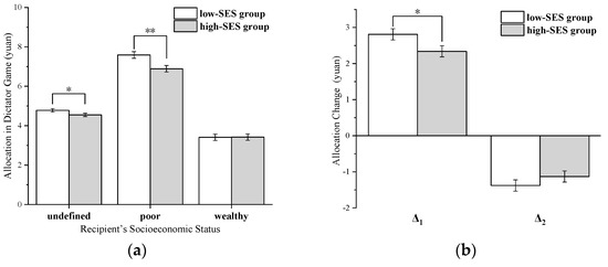 Additionally, the allocation amount in the undefined condition was set as the allocation expectation. Setting the expectation as a baseline, the amount of change was formed by subtracting the allocation expectation from the allocation amount when subjects faced poor and wealthy recipients. Δ1 is a positive increase towards the poor-recipient condition and Δ2 is a negative decrease in the wealthy-recipient condition (see Figure 2b). A repeated-measures ANOVA of 2 (dictator’s objective socioeconomic status: low SES/high SES) × 2 (recipient’s socioeconomic status: poor/wealthy) was conducted for Δ1 and Δ2. Results showed a significant main effect of the recipient’s socioeconomic status, F (1,251) = 572.91, p < 0.001, η2 = 0.70, with the amount given to the poor recipient (Δ1) (M = 2.58, SD = 1.73) being significantly larger than the amount given to the wealthy recipient (Δ2) (M = −1.25, SD = 1.75). However, the main effect of the dictator’s objective socioeconomic status was not significant, F (1,251) = 0.50, p = 0.48, M lses = 0.72, M hses = 0.61. The interaction between the dictator’s objective socioeconomic status and the recipient’s socioeconomic status was significant, F (1,251) = 5.00, p = 0.026, η2 = 0.02. A simple effect analysis was conducted and discovered that the amount allocated to the poor recipient (Δ1) was significantly different between the low-SES group and high-SES group, M lses (2.81) > M hses (2.34), p = 0.035; the reduction for wealthy dictators (Δ2) was not significantly different between the two groups, M lses = −1.38, M hses = −1.13, p = 0.255.