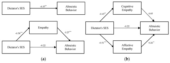 (a) Empathy as the mediator of the association between dictator’s SES and altruistic behavior in poor-recipient condition. (b) Cognitive empathy and affective empathy as mediators of the association between dictator’s SES and altruistic behavior in poor-recipient condition. Note: Dictator’s SES: 0 = low SES, 1 = high SES. ** p < 0.01. *** p < 0.001.