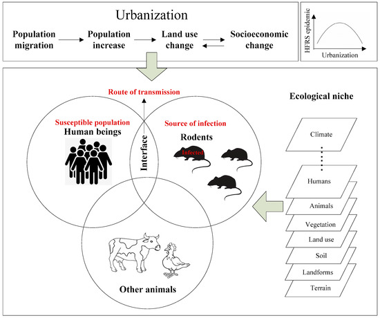 The HFRS epidemic is affected by urbanization in the following aspects. (i) In the natural environment, human beings and rodents occupy certain ecological niches. The ecological niche refers to a set of physical conditions that permit a positive turnover of the population of an organism; here, we integrated the abiotic and biotic niche definitions [65]. The physical conditions include environmental factors from terrain, landform, soil, land use, vegetation, animals, and humans to meteorological factors and the vertical climate (Figure 1). The ecological niches of human and rodents overlap with each other at certain scales [65]. Urbanization brings increased overlap of the ecological niches of rodents and human beings and particularly affects the ecotones defined as “edges or transitionary zones between adjacent ecological systems where biophysical factors, biological activities and ecological evolutionary processes are concentrated and intensified” [66,67]. This overlapping greatly affects the rodent population [49], its virus-carrying rate [48,50], and contact opportunity [22,34,35,63], and eventually influences the HFRS epidemic. (ii) Urbanization brings improvement in living, medical, and health conditions of humans, and vaccination programs target susceptible people, which combine to greatly reduce the HFRS epidemic by changing the rodent population [50], reducing contact opportunities, and increasing population immunity [34,35]. (iii) Urbanization plays the mentioned roles in a certain order. The early stage of urbanization greatly increases HFRS infection risk, while the mature stage of urbanization decreases HFRS infection risk. It was demonstrated as a “biphasic inverted U-shaped relationship between HFRS incidence and urbanization” in previous studies [26,30].