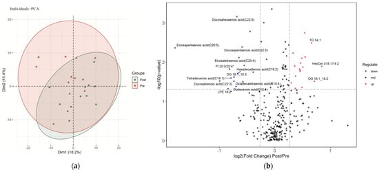 Characterization of serum lipids pre- and post-sprint interval training: (a) PCA (principal component analysis) of serum lipids pre- and post-sprint interval training; (b) volcano plot demonstrating the changes in serum lipids induced by sprint interval training. Lipids with labeling fold change > 1.5 or <1/1.5 and p < 0.05.