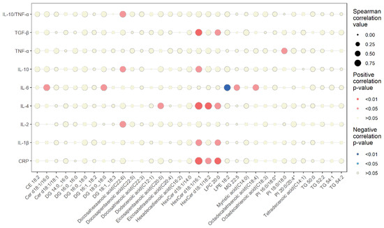 Spearman correlations between changes in differential serum lipids and inflammatory markers. The dot size represents the correlation value. The shade of the dot color represents significance (blue, negative correlation; red, positive correlation).