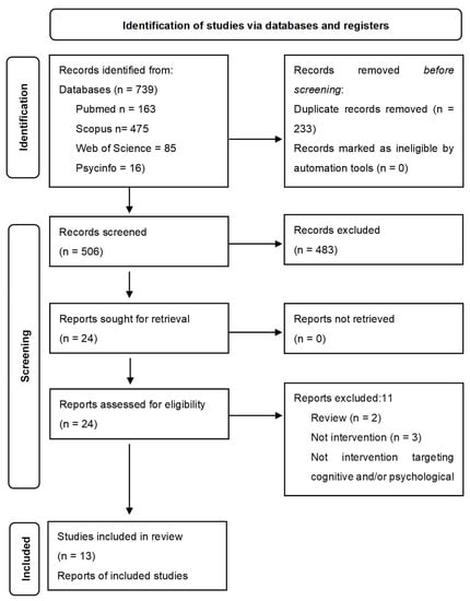 Our search retrieved 739 articles in total. After removing 233 duplicates, 506 relevant articles were screened based on title and abstract. Of those 506 articles, 483 were excluded, and 24 potentially relevant articles were screened in full text. Of these papers, 11 were excluded based on the inclusion/exclusion criteria. Finally, 13 articles were eligible for inclusion in this review (Figure 1).