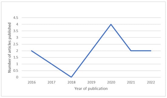 As mentioned previously, we searched for articles published between 2012 and 2022. However, all 13 studies included in this review were published between 2016 and 2022, with 8 of them (61.5% of the studies) being conducted between 2020 and 2022 (Figure 3).