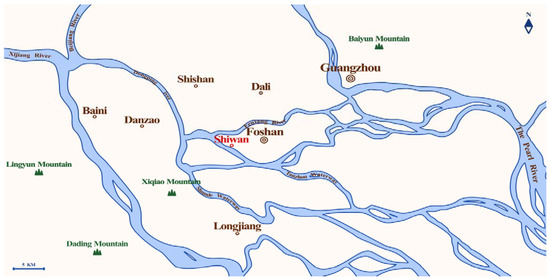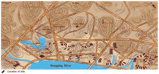 As a result of environmental adaptation, the culture of Shiwan pottery sculpture technique cannot be separated from the local unique geographical location, natural resources, climatic conditions, and so on. Shiwan was originally under the jurisdiction of Shizhou Village, Foshan Town, Nanhai County; the geographical location of Shiwan kiln can be divided into a narrow and broad sense [23] (p. 9). The narrow sense of Shiwan kiln usually refers to the north and northeast banks of Dongping River in Foshan, the narrow strip west of Dawugang, east of Haikou, and north of Lanshi (Figure 1). There are many rolling hills distributed in this area, most of which are red earth hills formed in the Quaternary period. The soil quality is excellent, and it contains rich clay and sandy soil, providing high-quality fetal soil for pottery making. More than 100 dragon kilns were built in succession on the hillocks near the river and where the potters gathered in the town [24]. The branches of Dongping River are densely distributed, providing an inexhaustible source of water and water transportation for pottery making. The metal-rich silt at the bottom of the river, shells on the river beach, mulberry trees and straw on the hills provide rich raw materials for glaze making [25] (pp. 73–77). At the same time, Shiwan’s land transportation is also very developed; especially the railways and highways provide great convenience for transportation of raw materials and products of ceramic industry [24]. The core area of modern Shiwan pottery and the ancient terrain has changed a lot, the ancient Jiangwan has now become a flat land [23] (p. 9) (Figure 2). In terms of climate conditions, Shiwan is located in the area of 113°10′ to 113°12′ east longitude and 23° to 23°2′ north latitude. The village is about 6 square kilometers. It is a subtropical area with a mild climate, abundant rainfall, and sufficient sunshine, like spring all the year round [23] (p. 14).