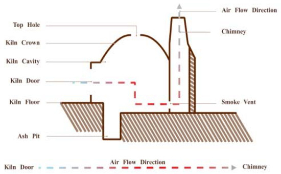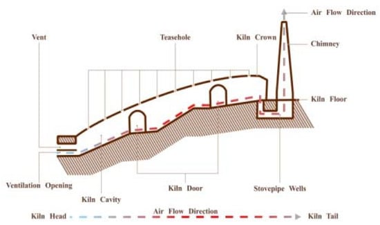 Firing: The calcination of Shiwan kiln is divided into several steps such as preheating, firing, and high-temperature reduction. According to the archaeological evidence, the earliest ancient kiln site discovered in Shiwan appeared in the Tang Dynasty, which is a semi-inverted flame steamed bun kiln site (Figure 3) [23] (p. 21). The firing chamber of this kiln is in front of the kiln bed, and the chimney is set at the back of the kiln. The flame sprays from the fire chamber to the kiln crown and then falls to the kiln bed, flows through the blank, and then the smoke is discharged out of the kiln through the smoke outlet and the vertical flue, and the flame is half inverted [26] (p. 378) (Figure 4). Later, it gradually becomes a “Dragon Kiln” leaning upwards against the mountainside (Figure 5). Shiwan dragon kiln is streamlined, with thin ends, a large middle, a steep lower section, and a gentle tail section. The shape of the inner kiln cavity is smooth and reasonable, which is conducive to the rise and fall of hot gas and the control of atmosphere, and has excellent charging and firing performance [27] (Figure 6). At present, the largest dragon kiln in Shiwan is Nanfeng Ancient Kiln, which has been burning for 500 years [28].