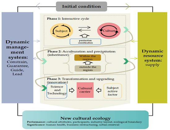 When the dynamic balance of the original cultural ecology is defeated, the original elements will flow in the form of resources and information, forming management and resource systems. Specifically, the resources within the resource system include natural resources such as geographical location and climate conditions, as well as social resources such as talents, site space, and market reputation. The resource system plays a supply role in the subsequent phase, while results generated will be fed back to the resource system to keep it always in a dynamic state. In the same way, information is regarded as the product of human processing, which mainly forms a management system. The management system also has an effect on the process of each phase and receives feedback. Through continuous improvement, the management system forms a modern social governance system from the state to local governments and then to the grassroots. With the guarantee means of law, directory establishment and financial support, with the guiding ideology of inheritance purpose, academic research and urban construction planning path, and by taking the lead in establishing a number of urban benchmark projects to drive the development of other industries, it mainly provides regulation, guarantee, guidance, and leadership for the evolution phase. Since the interaction between the two systems and phases is always continuous, the subsequent phases will not be repeatedly emphasized under unnecessary conditions.