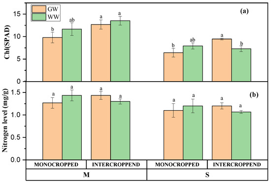 Plant leaf chlorophyll content (a) and nitrogen level (b) under different water treatments and planting patterns. Note: M: maize; S: soybean; GW: groundwater; WW: wastewater. All data are represented as means ± standard errors (n = 6). Different letters indicate statistically significant differences between treatments at p < 0.05.