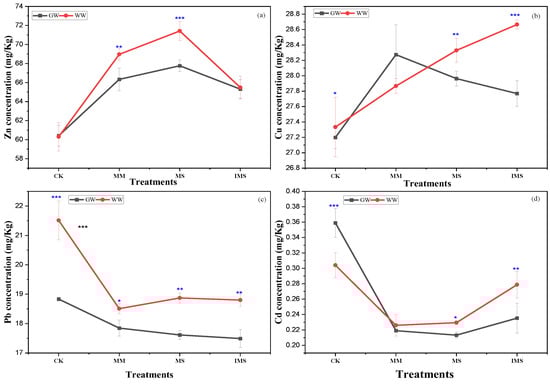 Concentrations of Zn (a), Cu (b), Pb (c), and Cd (d) in soil under monoculture and intercropping systems. Note: GW: groundwater; WW: wastewater; CK: uncultivated soil; MM: maize monocultured soil; MS: soybean monocultured soil; IMS: maize/soybean intercropped soil. All data are represented as means ± standard errors (n = 6) (* p < 0.05, ** p < 0.001, *** p < 0.0001).