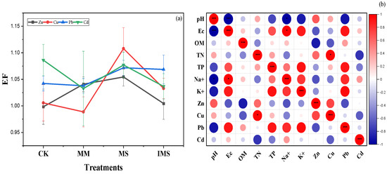 Enrichment factor for Zn, Cu, Pb, and Cd (a), and correlation between soil chemical properties and heavy metals enrichment factor (b). Note: CK: irrigated and uncultivated soil; MM: monocultured maize soil; MS: monocultured soybean soil; IMS: intercropped maize/soybean soil. All data are represented as means ± standard errors (n = 6) (* p < 0.05, *** p < 0.0001).