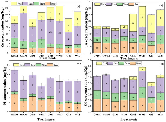 Heavy metals’ mobility in various crops’ organs under intercropping of maize and soybean. Zn concentration (a); Cu concentration (b); Pb concentration (Pb was not detected in fruit) (c); Cd concentration (d). All data are represented as means ± standard errors (n = 6). Different letters indicate statistically significant differences between treatments at p < 0.05.