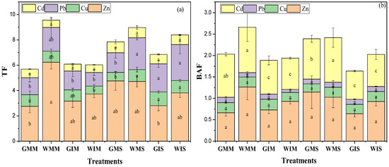 Translocation factor (a) and bioaccumulation (b) for Zn, Cu, Pb, and Cd in crops. All data are represented as means ± standard errors (n = 6). Different letters indicate statistically significant differences between treatments at p < 0.05.