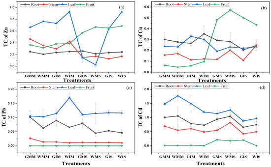 TC of Zn, Cu, Pb, and Cd was the ratio between the concentration of a metal in plants by the concentration of that metal in the soil. High TC reflects relatively poor retention in soil or greater efficiency of plants to absorb metal, and low TC reflects the strong sorption of metal to the soil colloid [35].