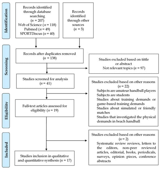 The four exclusion criteria are as follows: (1) analysed training demands or game-based training demands; (2) analysed simulated or friendly matches; (3) investigated the physical demands in beach handball; (4) the sample was composed of amateur handball players or students. Systematic reviews, reviews, letters to the editor, articles that were not peer-reviewed, editorials, books, periodicals, surveys, opinion pieces and conference abstracts were considered as support materials in the search process for potentially valid research according to the aim of the study.
