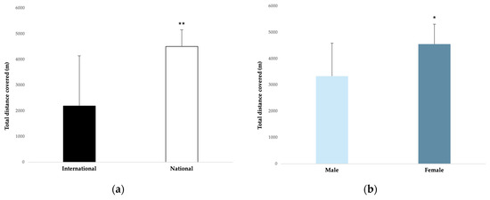 (a,b). Total distance covered according to the competition level and gender. The magnitude of the standardised differences (effect size) between the competition level and gender is indicated by the number of symbols: one symbol stands for a moderate difference and two for a large difference.