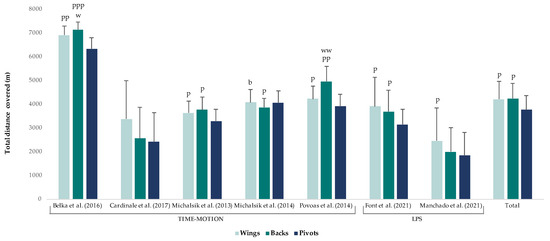 Total distance covered according to playing positions. The magnitude of the standardised differences (effect size) between the different positions is indicated by the number of symbols: one symbol stands for a moderate difference, two for a large difference and three for a very large difference. b stands for substantial difference vs. backs, w vs. wings and p vs. pivot [10,12,15,40,42,43,48].