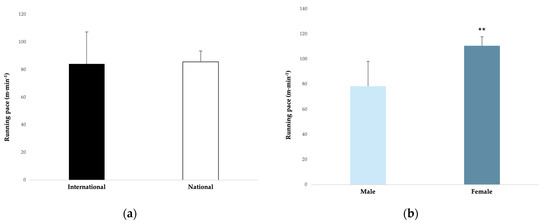 (a,b). Running pace related to the competition level and gender. The magnitude of the standardised differences (effect size) between the competition level and gender is indicated by the number of symbols: two for a large difference.