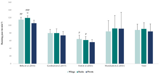 Running pace according to playing positions. The magnitude of the standardised differences (effect size) between the different positions is indicated by the number of symbols: one symbol stands for a moderate difference, two for a large difference, three for a very large difference. B stands for substantial difference vs. backs, w vs. wings and p vs. pivot [10,12,15,40].