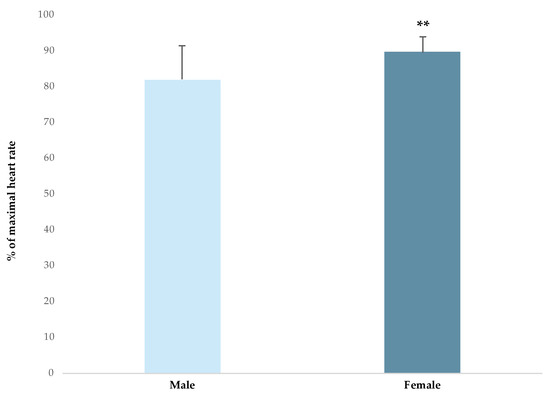 Heart rate responses according to the gender. The magnitude of the standardised differences (effect size) between the competition level and gender is indicated by the number of symbols: two for a large difference.