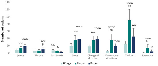 Technical activity according to playing positions. The magnitude of the standardised differences (effect size) between the different positions is indicated by the number of symbols: one symbol stands for a moderate difference, two for a large difference and three for a very large difference; b for substantial difference vs. backs, w vs. wings and p vs. pivot. Data were merged from different studies: throws data come from Michalsik et al. [45,46] and Povoas et al. [48]; fast breaks from Michalsik et al. [45,46]; jumps, stops, COD and one-on-one situations from Povoas et al. [48]; tackles and screenings from Michalsik et al. [46].
