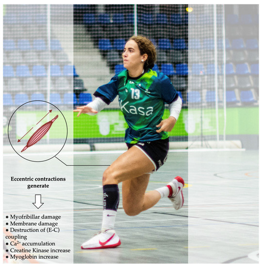 Font et al. [15] indicated that wings, backs and pivots performed a similar number of accelerations and decelerations. On the other hand, HIA and HID were different between playing positions [15]. Wings (134.8 ± 60.7) performed slightly more HIA than backs (128.1 ± 55.2) and pivots (112.0 ± 33.6) (ES = 0.12 and 0.46, respectively); in contrast, backs (114.6 ± 51.77) performed a similar number of HID than wings (112.9 ± 56.0) and slightly more than pivots (99.6 ± 28.9) (ES = 0.03 and 0.3, respectively). These findings could suggest that wings performed more HIA because they have an important role in the counter-attack phase [45,46]; nevertheless, backs performed more HID because they have the main responsibility of building up the positional attack, which is characterised by a constant piston movement [62]. This handball-specific pattern is associated with intense eccentric contractions that generate important neuromuscular fatigue and tissue damage, especially if these high forces cannot be attenuated efficiently [63,64]; specifically, the physiological consequences of repeated HID (eccentric contractions) have been well documented (Figure 8) [65]. Therefore, strength and conditioning coaches should include different types of exercises during training sessions to develop the capacity of muscles and tendons to attenuate high eccentric forces, especially in back players [63,64]. Moreover, pivots performed fewer HIA and HID because their actions (e.g., high level of isometric force to block their opponent) do not always produce a movement or an acceleration [15,50].