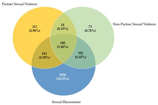 Figure 1 shows the number of women who had suffered the different types of SV. The frequency of SH alone was recorded to be 30.52%, whilst PSV and NPSV alone in the present sample were 2.96% and 0.76%, respectively. Fourteen women (0.15%) reported having suffered PSV and NPSV; 411 women (4.30%) had suffered PSV and SH; and 392 (4.10%) had suffered NPSV and SH. Finally, 140 women (1.46%) had been victims of all three examined types of SV at some point during their lives.