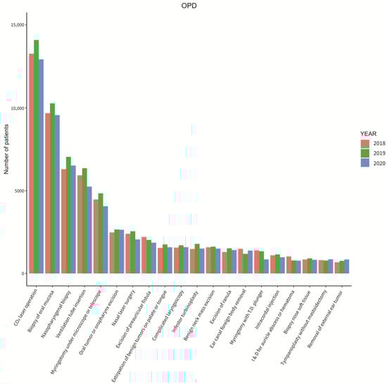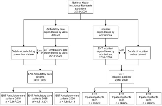 This study was a case-compared, retrospective, cohort database study to detrmine the before and after effects of COVID-19 prevention measures on infectious and non-infectious diseases. The database search included otolaryngology inpatients and outpatient data from 2018 to 2020, collecting all the different diagnoses and categories of surgical procedures, and the number of visits, as seen in Figure 1. The inpatient and outpatient operations are included according to the operation codes in the National Health Insurance Payment Standard. The total inpatient and outpatient cases are identified in Table 1 and Table 2. All operations that were performed by otolaryngologists from 2018 to 2020 were included in this study, and were then divided into inpatient groups and outpatient groups, according to whether the patients were hospitalized. All groupings of the diagnoses of the outpatients in the otolaryngology department are in Appendix A, Table A1. An additional analysis of unexpected inpatient diagnoses in the otolaryngology department was performed. All patient characteristics were available from the database.
