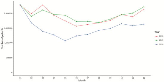 Figure 2 displays the monthly number of outpatients from 2018 to 2020. There was a major decreasing number of cases from January 2020 to May 2020, until it slowly increased from June 2020 to December 2020.