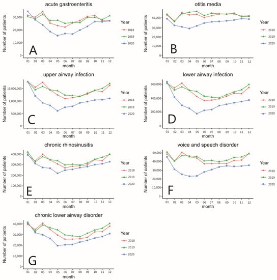 (A) The total number of outpatients of acute gastroenteritis, (B) otitis media, (C) upper airway infection, (D) lower airway infection, (E) chronic rhinosinusitis, (F) voice and speech disorder, and (G) chronic lower airway disorder from 2018 to 2020.