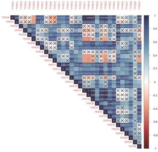 Correlation matrix between the diagnoses grouping. (“X” in the correlation matrix represents p > 0.05).