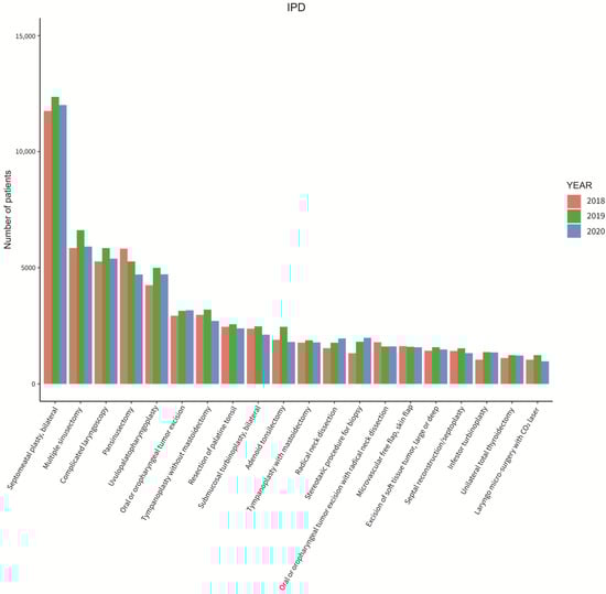 Total otolaryngology surgeries performed on inpatients in 2018 to 2020.