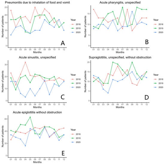 The total number of unexpected inpatient diagnoses of (A) pneumonitis, (B) acute pharyngitis, (C) acute sinusitis, (D) supraglottitis, and (E) acute epiglottitis from 2018 to 2020.