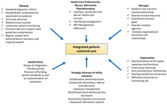 The national and international concepts and models of integrated care, including the benefits for PLWH, could be presented comprehensively in this review. In addition, this review focuses on the complexity of HIV/AIDS in the context of chronic disease. The complexity of HIV infection with the specific problems (ART, adherence, disease management, comorbidities, symptoms, side effects, long-term toxicities, lifestyle, obesity, a lack of exercise, nicotine abuse, and alcohol and drug abuse) and implicit experiences and burdens (stigma, discrimination, hopelessness, anxiety, depression, isolation, and loneliness) of PLWH establish the need for integrated care to be a necessary patient-centered approach to treatment [,,]. The term integrated care is not uniformly defined and is often used as a synonym for different models of care [,,]. The collaborative participation of physicians with health care professionals from other professions represent the pillars of integrated care for PLWH [].