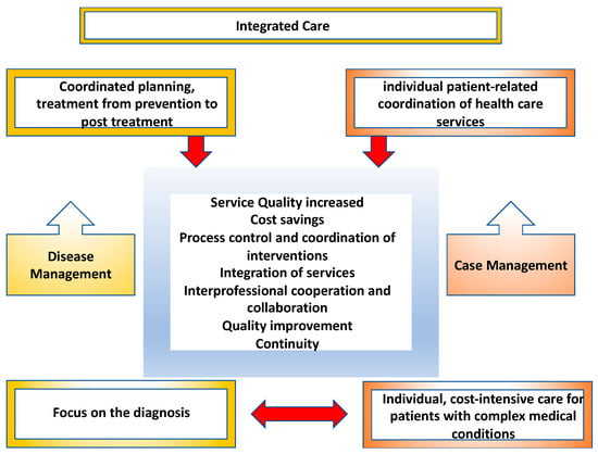 This ranges from the activities of general practitioners, special institutes, laboratories, social insurance institutions, and radiology for imaging diagnostics to inpatient and outpatient settings in hospitals, as well as prevention and therapy in rehabilitation centers [,]. IC has become established in Europe and represents a form of care management in which the focus is on the treatment process of the chronically ill person [,]. There is not yet a standard definition of integrated care. The term arose in the context of managed care in the USA and describes various aspects in the design of patient care, the essential features of which are based on the more optimal networking of different service providers, the mobilization of efficiency reserves, and measures that contribute to quality assurance [,]. A significant part of integrated care focuses on the process of treatment rather than the individual case, so the interprofessional and interdisciplinary health care professionals are connected and communicate with each other via interfaces [].